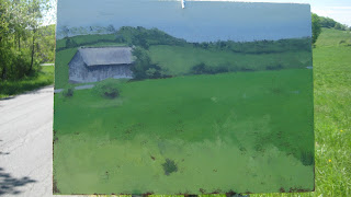 This is a favorite spot, and area, but the view is different, still it contained road foreground, fields, middle ground and hills background, a favorite general arrangement. I had in my head "paint what you know" when I set out so I did.