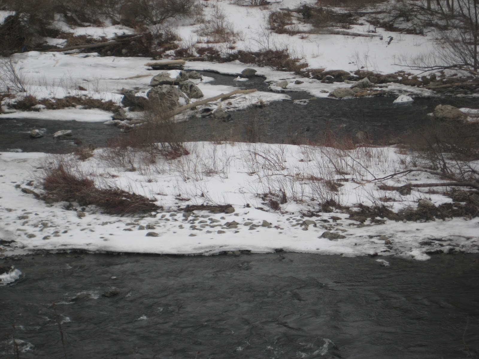 This spot is up on a knoll, the falls are to the right, or the south, and I'm looking east, the snow is hard packed and would be treacherous, but for some fresh stuff on top of the ice providing traction, I left a few feet to the edge, I may be nuts, but I'm not stupid!
